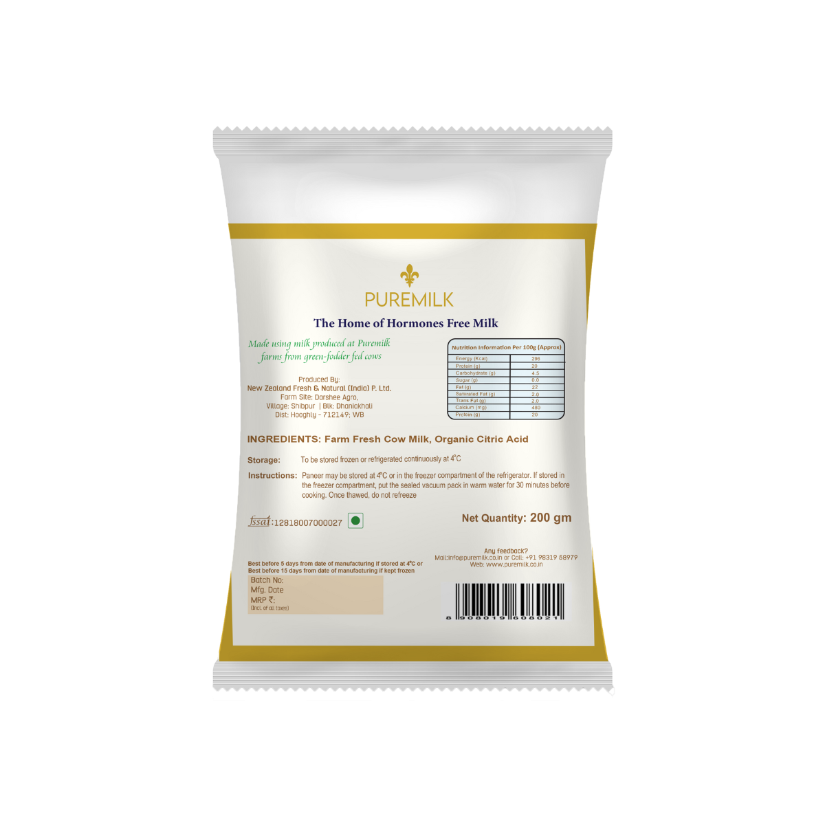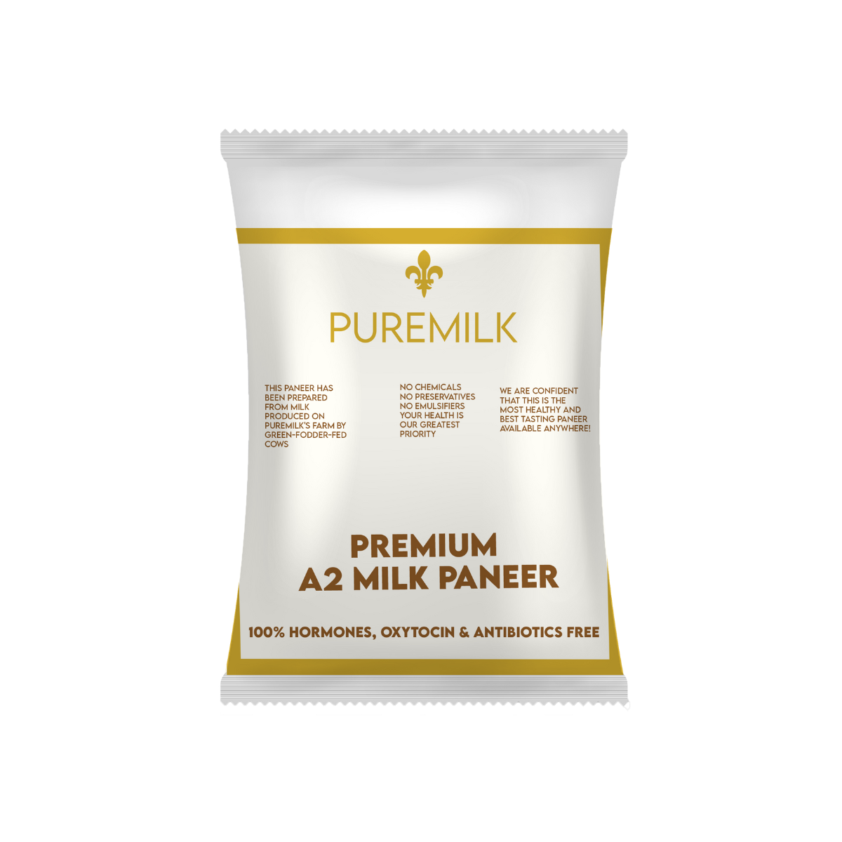 Our artisanal A2 milk paneer has been prepared from milk produced on our own farms by green-fodder-fed-cows and is 100% free of injected Hormones, Antibiotics and Oxytocin. We give you the finest quality paneer packed with nutrients and containing no added preservatives.