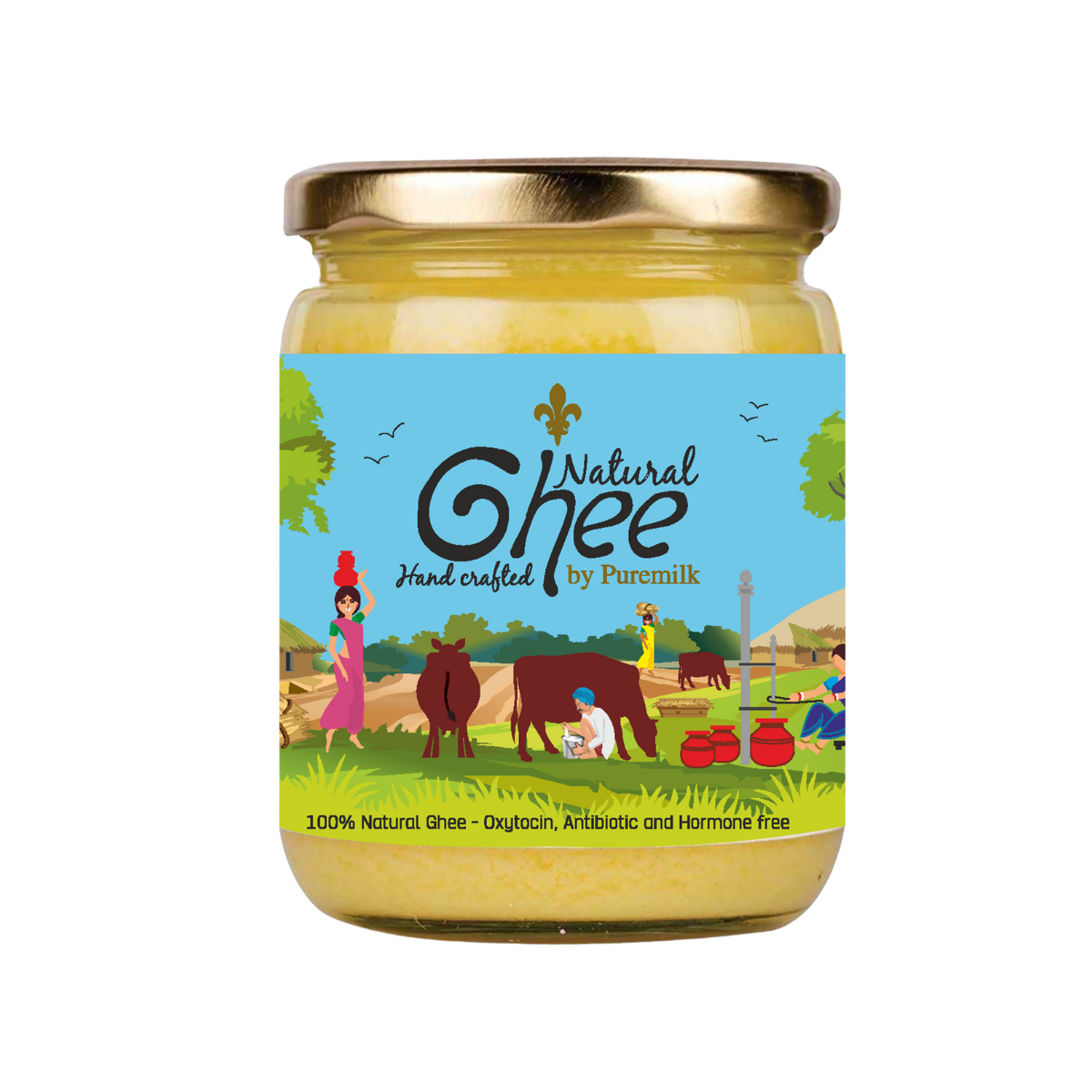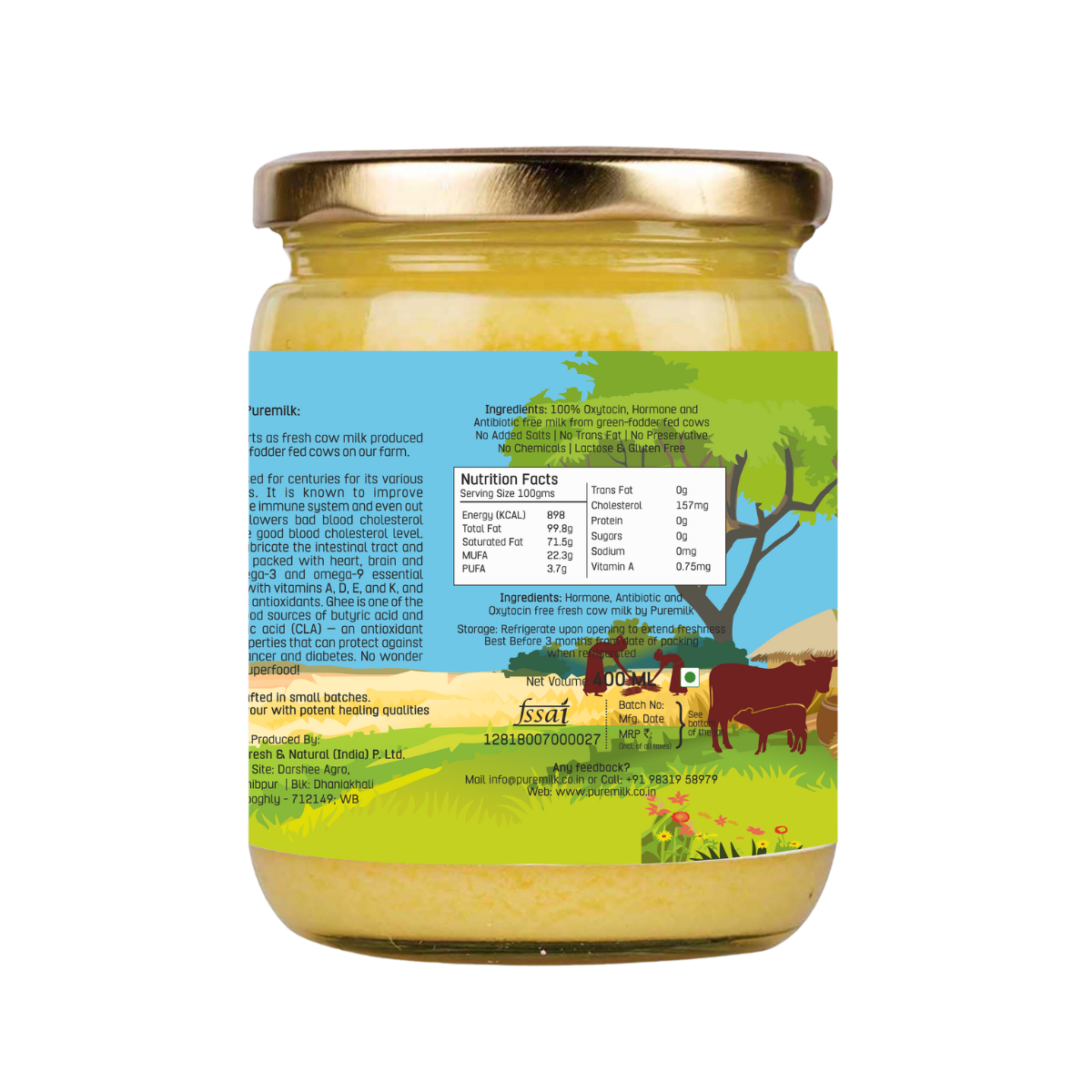 Our artisanal ghee has been prepared from milk produced on our own farms by green-fodder-fed-cows and is 100% free of injected hormones, antibiotics and oxytocin.